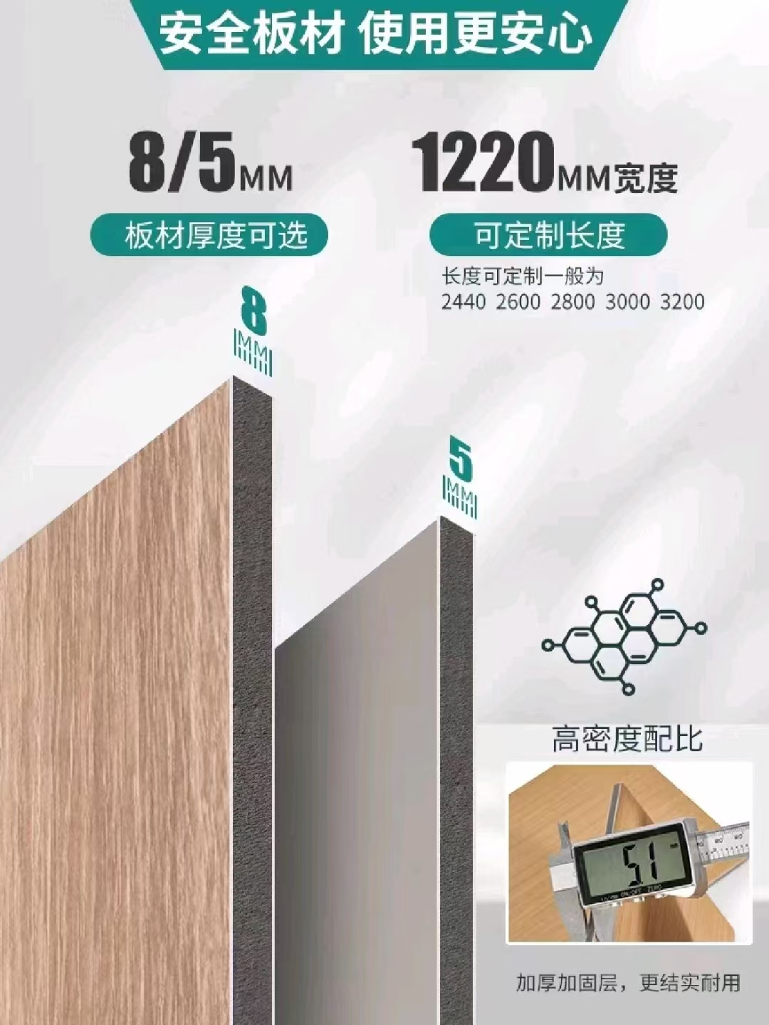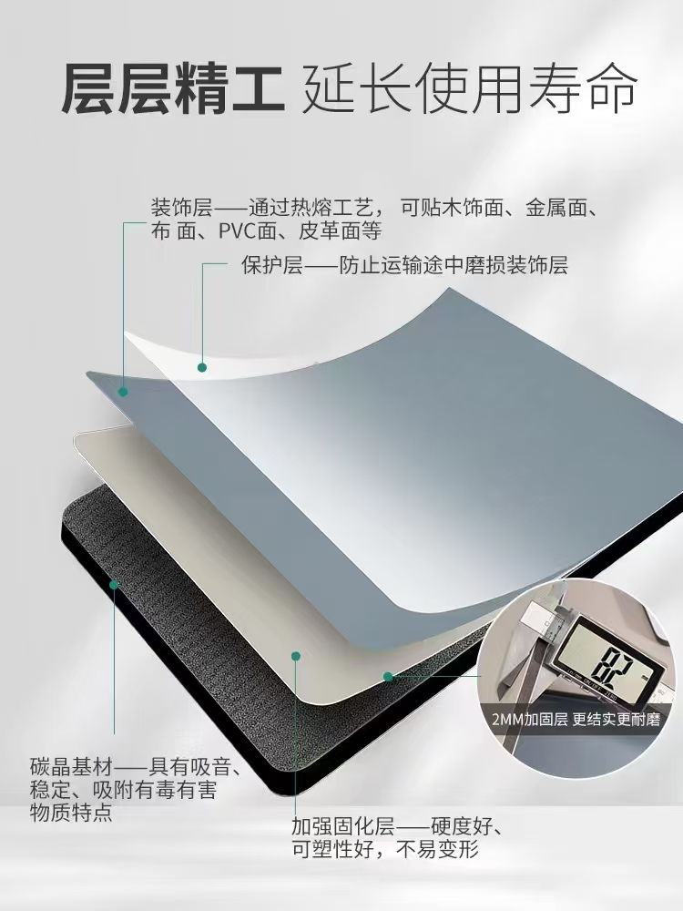 “高密度碳晶板”學名“竹炭共擠飾面板”是一種采用高溫擠壓工藝制成的木塑板,原料是竹炭粉、鈣粉、PVC樹脂和助劑等,這種擠塑型的板材上下兩面是硬質共擠層,硬度優良。碳晶板是在普通木飾面板基礎上全面升級后的功能性板材,除了比原有木飾面板更優越的環保性,還具有更高的耐磨性,更好的抗沖擊性能,更高級的裝飾性。高密度碳晶板采用雙面共擠工藝生產,基材通過PUR熱熔膠工藝覆上木紋、布紋、純色、石材紋、金屬(金屬拉絲)、玻璃、膚感等花色面膜,花色豐富多樣,可以滿足家居、商用空間等各種不同風格的裝飾效果。其定制周期更短,一般在3-7天左右,屬于扣板式結構,模塊化安裝、施工快、安裝方便、工期短,對于裝修時間短的商業空間是一個很好的選擇。高密度碳晶板具有較高的硬度和耐磨性,不易被劃傷或磨損,且表面光滑,不易吸附污垢,具有一定的防水性能,易于清潔和維護,能夠保持長久的美觀。碳晶板高度、寬度可以任意裁切調整,可以現場開槽折彎,包墻角、柱子,實現各種奇異造型。